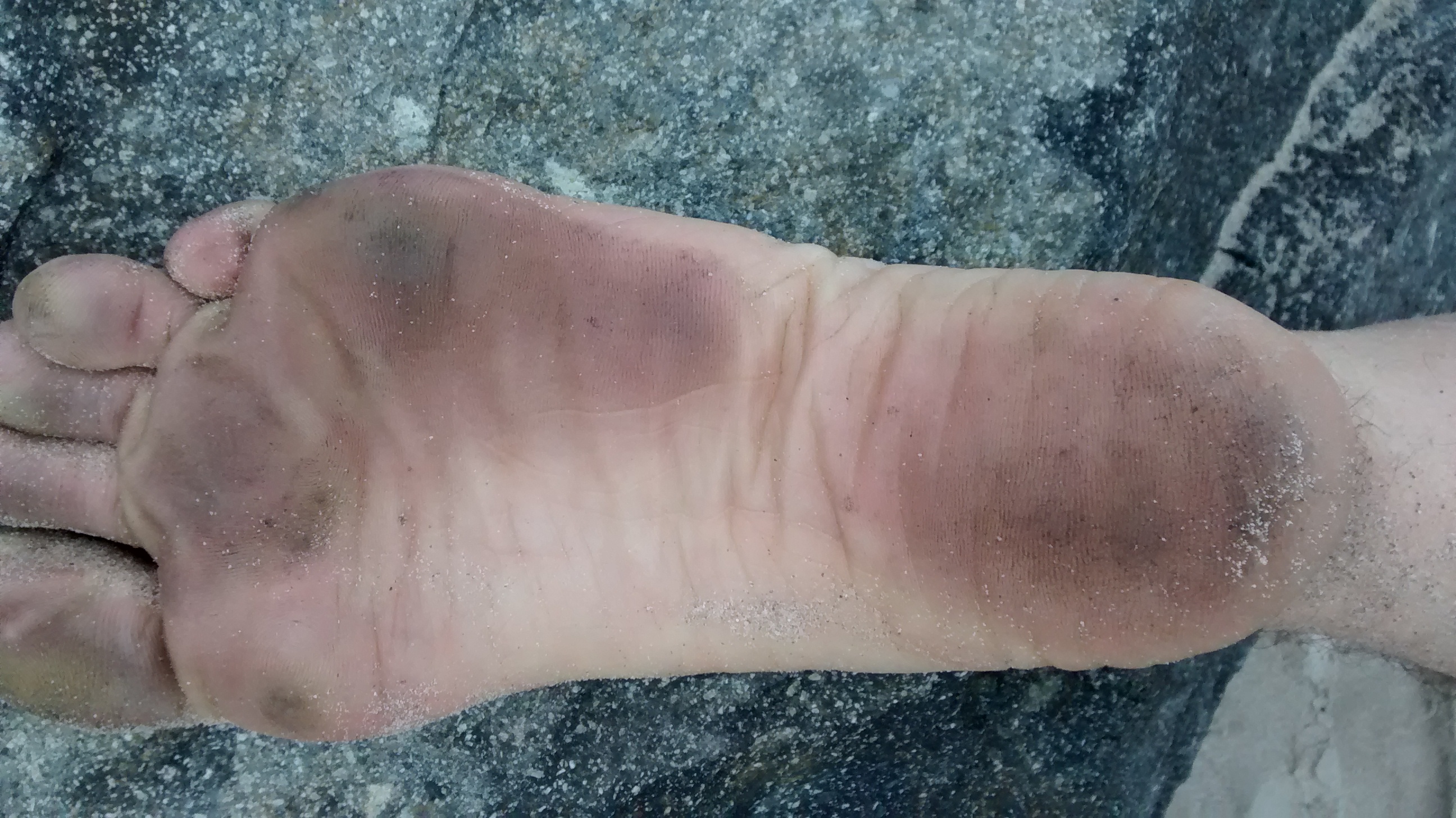 There are a couple of things that made this barefoot hike possible. I have strong feet and legs due to years of running and walking around both barefoot and in minimalist footwear, along with regularly engaging in conventional strength training. Moving barefoot outdoors on different surfaces has resulted in thicker, stronger skin on the soles of my feet. Known as plantar skin, it naturally toughens as an adaptation to increasingly rough stimulation. I was stepping on lots of jagged-surfaced rock, and though it was sometimes painful, my thickened plantar skin was up to the task.